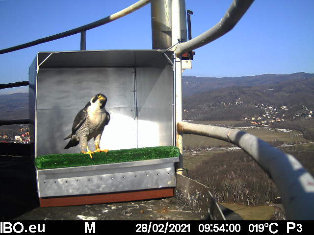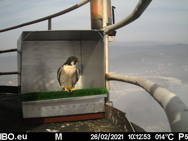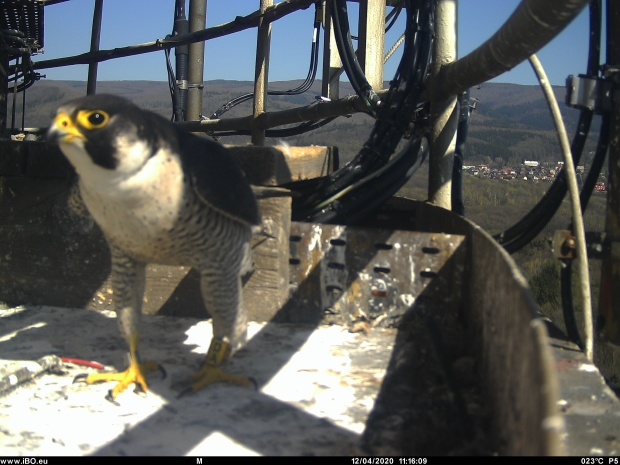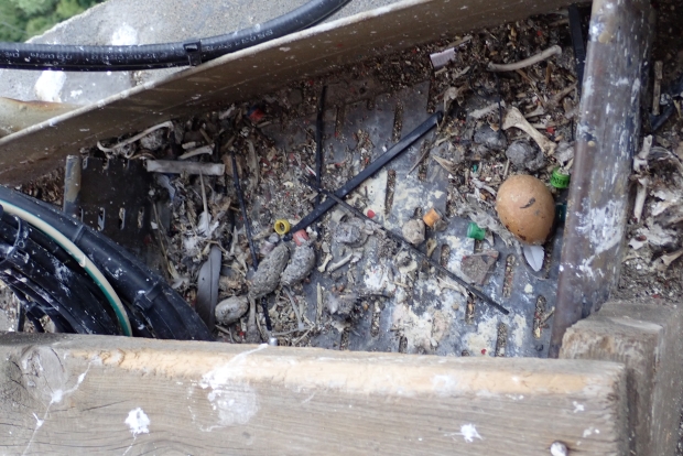 sokolí vejce v chráničce kabelů na ochozu komína v roce 2020