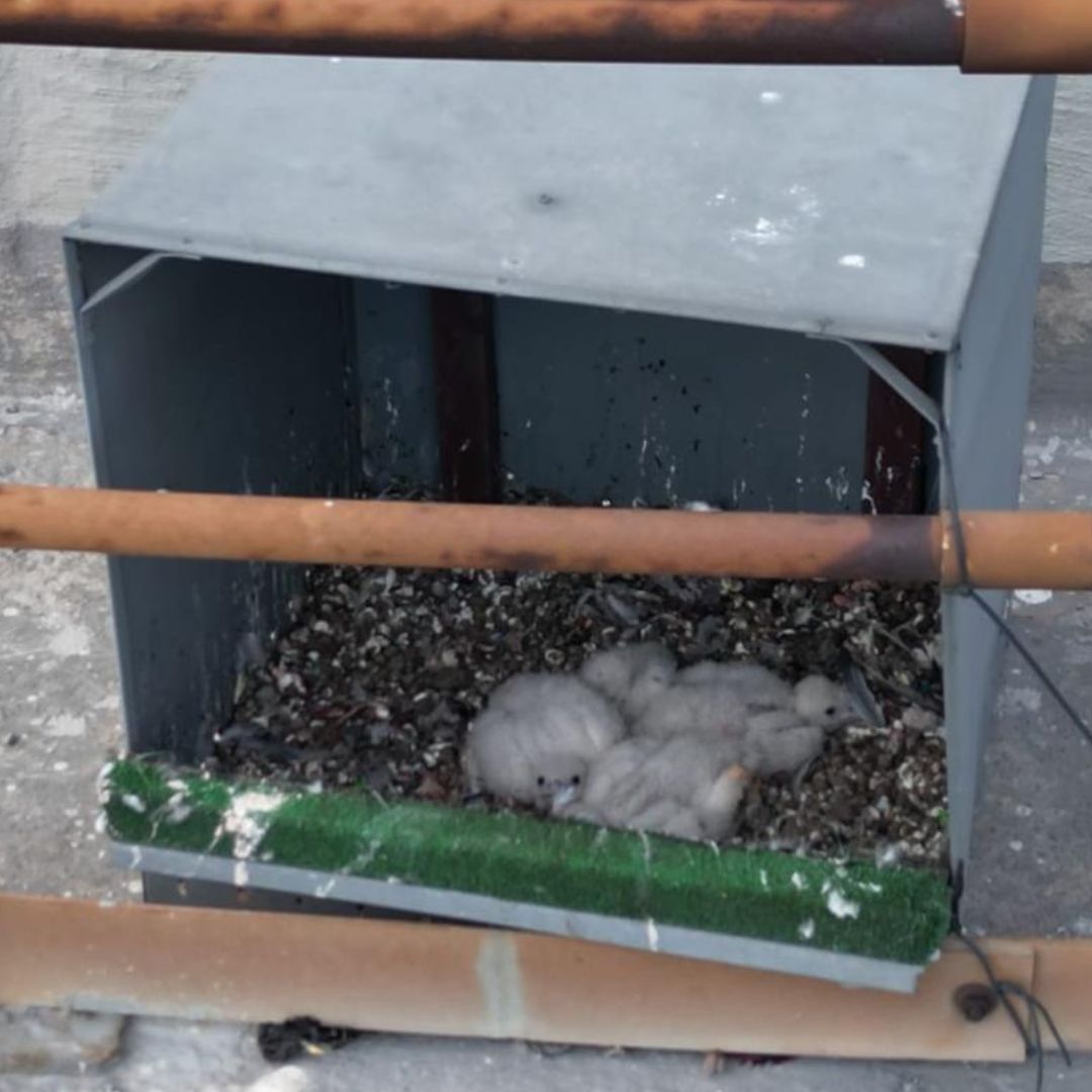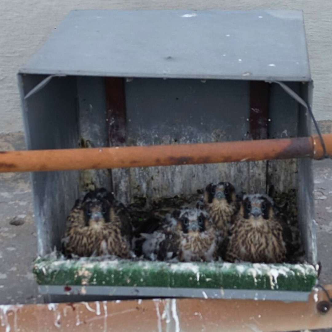 V roce 2024 se na komíně ve výšce 150 m narodila čtyři mláďata. Na první fotce z dronu vidíte mláďata, kterým bylo teprve deset dní. Na druhé fotografii jsou mláďata měsíc stará.