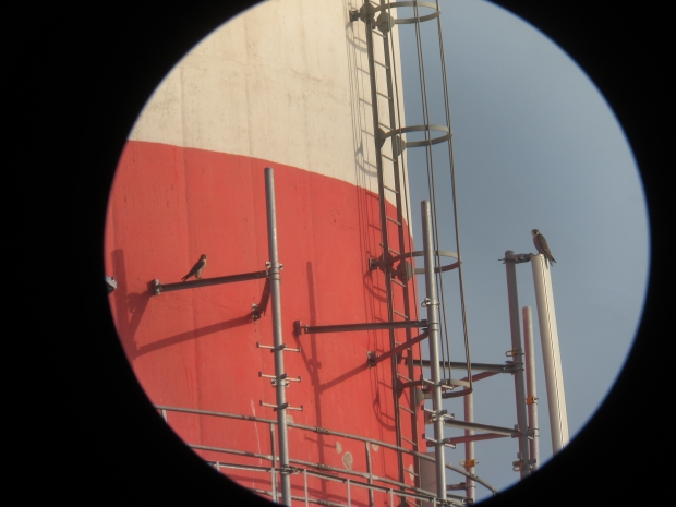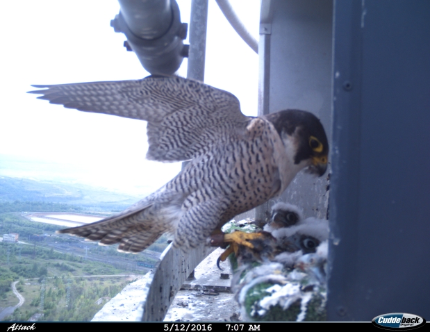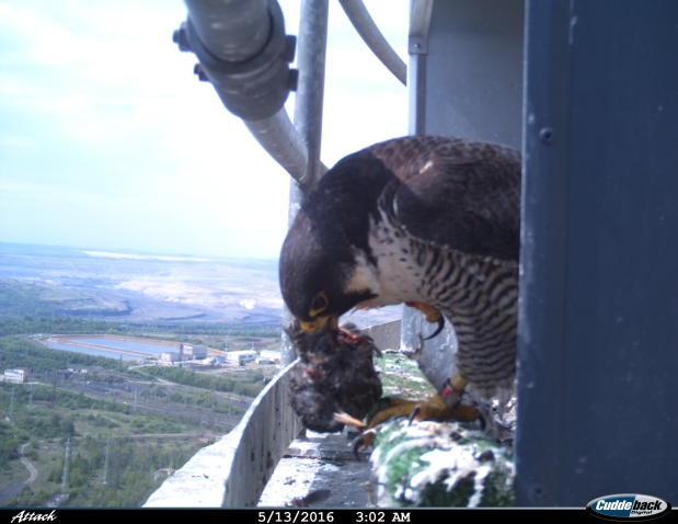 Budky byly na základě pozorování sokolů instalovány v březnu 2014, jedna na střechu kotelny, druhá na komín. V době instalace budky měl pravděpodobně pár o hnízdišti jasno a hnízdění proběhlo na římse kotelny částečně zarostlé vegetací. Pár úspěšně vyvedl tři mláďata. Následně již pár hnízdí v budce na ochozu komína a každoročně vyvádí mláďata: 2014 a 2015 tři, 2016 čtyři, 2017 dvě, 2018, 2019 a 2020 tři. V prvních letech zde hnízdil pár značený německými kroužky, odečet se zde ale nikdy nepodařil.